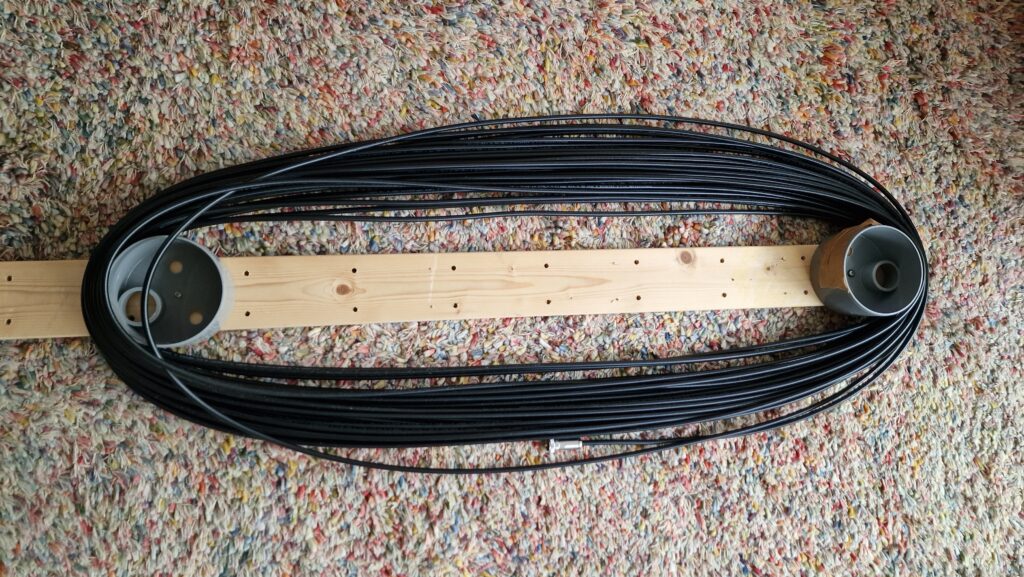 I received 100 meters of ExtraFlex 7 Bury coax cable from my sponsor Messi & Paoloni, including PL259 7 EVO connectors. I have cut this into pieces of 30 meters and 70 meters. This 100 meters of coax weights just 6 KG and can handle up to 1450 Watts on 28 MHz. It is the lightest coax with that power handling, so ideal using for a DXpedition where weight is a limiting factor. I coiled the cble like on the picture, so it would best fit into the golf bag.